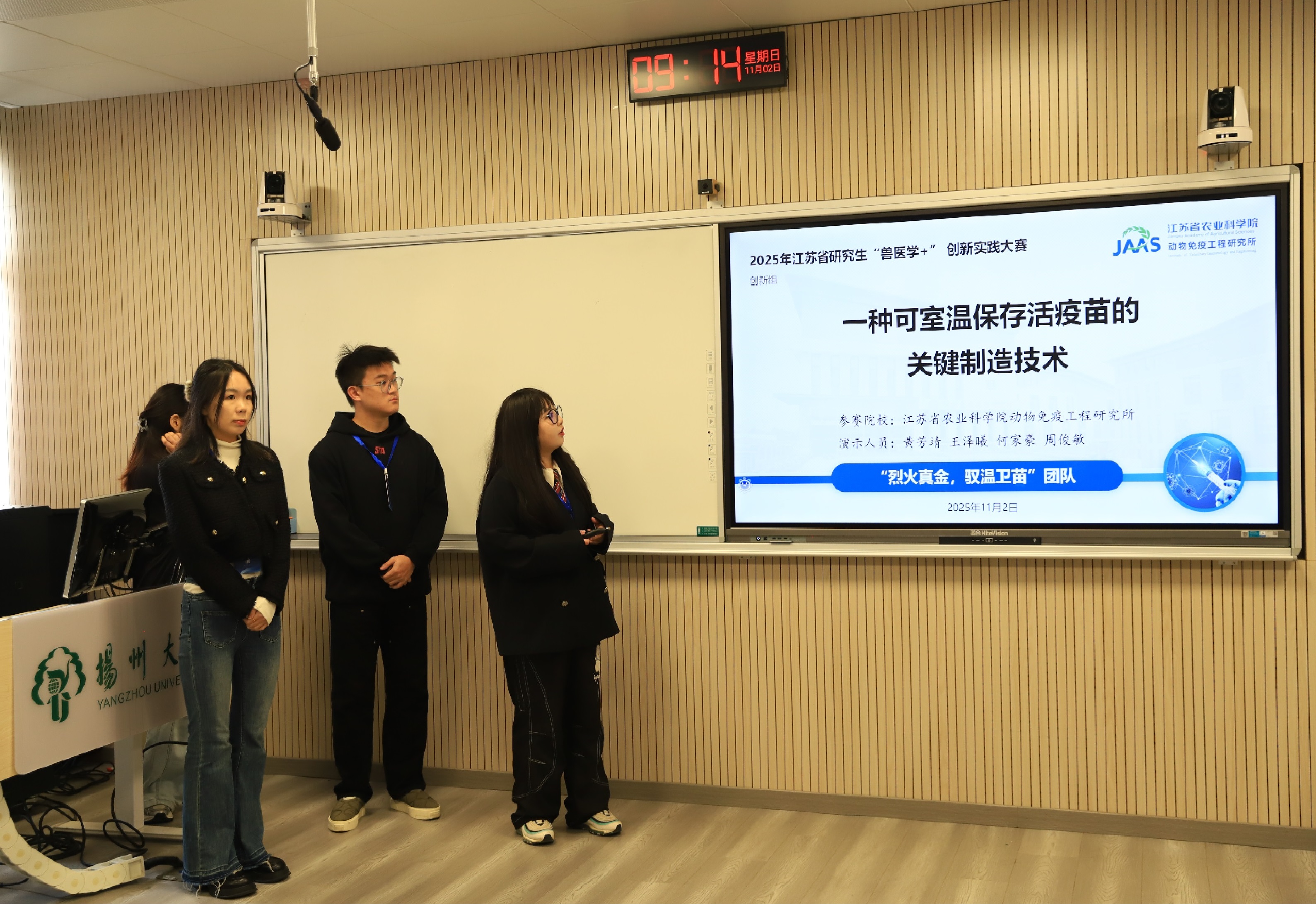 在首届江苏省研究生“兽医学+”创新实践大赛中,动物疫苗制剂工程创新团队联合扬州大学、南京农业大学和福建农林大学的8名联培研究生(黄芳靖,王泽曦,何家豪,周俊敏,袁安琪,魏盛博,孙玮蔓,陈建丞)组成“烈火真金,驭温卫苗”团队,凭借项目《一种可室温保存疫苗的关键制造技术》荣获大赛特等奖。该项目针对兽用疫苗储存运输依赖冷链的行业痛点,研发疫苗耐热关键制造技术,显著提升疫苗的室温稳定性,对降低防疫成本、提升基层疫苗可及性具有重要意义,充分体现了“兽医科技赋能乡村振兴”的大赛主题。