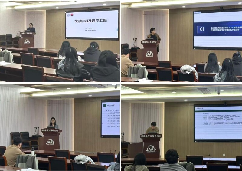 会上,来自南京农业大学、河南科技大学、扬州大学、福建农林大学等联培高校的谢佳慧、杨迎辉、王泽曦和陈建丞四位同学,分别围绕无针注射皮内免疫、佐剂应用、噬菌体展示技术等方向,汇报科研进展、分享文献学习心得。交流环节中,研究生们积极探讨、各抒己见,导师们则从实验设计、数据严谨性、文献学习对课题的启发等维度,给予细致指导和针对性建议。