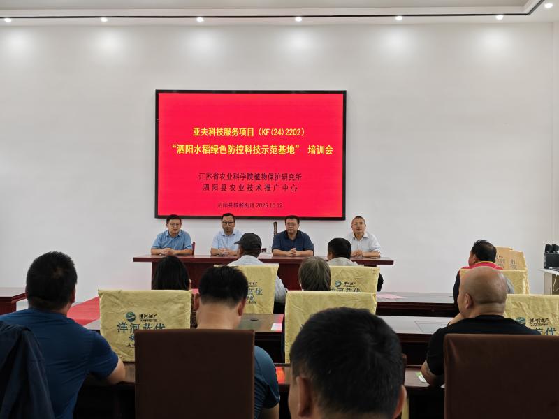 10月12日,为展示亚夫科技服务项目“泗阳水稻绿色防控科技示范基地”(KF(24)2202)的实施成效,进一步提升水稻种植大户的生产管理水平,做好杂交水稻收获归仓,项目牵头单位植保所植物细菌创新团队联合泗阳县农业技术推广中心、泗阳县子健粮食种植家庭农场召开了技术培训和现场观摩会。宿迁市农业技术综合服务中心杨超研究员、泗阳县农业技术推广中心副主任李山东高级农艺师、植保所副所长樊磊研究员、项目团队成员、城厢街道部分种植大户、专业合作社及农资经销商等30余人参加了技术培训,会议由李山东主持。