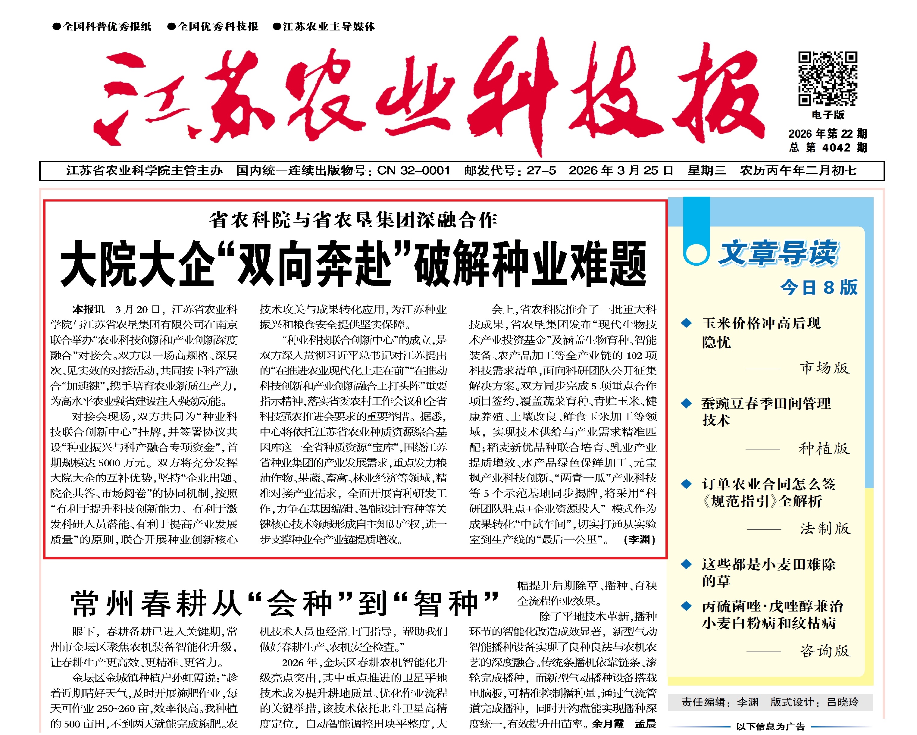 [江苏农业科技报]省农科院与省农垦集团深融合作 大院大企“双向奔赴”破解种业难题