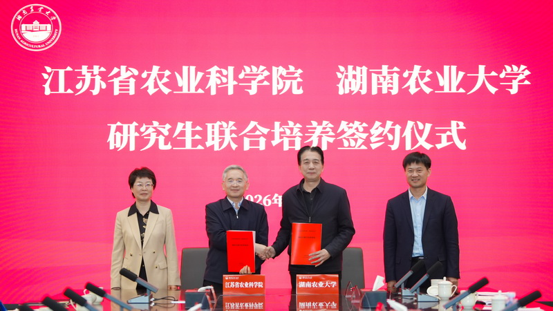 在湖南农业大学,党委副书记、校长唐文帮,党委副书记陈光辉陪同调研。唐文帮介绍了湖南农业大学的基本情况,并就学校薪酬体系建设、人才引育政策、教育科技人才一体化改革等方面工作举措作了说明。朱艳介绍了我院的基本情况,并对我院联合培养研究生的现状进行了说明,希望能以此次交流为契机深化双方合作对接,以人才共育为纽带,以项目合作为牵引,充分发挥各自资源与优势,推动农业科技创新与产业创新。会上,孙洪武和陈光辉代表双方签订研究生联合培养协议,协议将通过采取“联合指导、联合授课;联合考核、联合奖助;联合管理、联合建设”的培养模式,推进人才培养链与产业链对接融合、教育资源与科研资源紧密整合,培养具备高度创新意识、创新能力、科研素养、综合实践能力的高层次、高水平的创新型卓越农业人才。