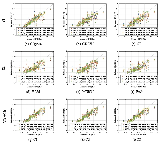 实验结果表明,相比原始冠层光谱图像,利用映射数据构建的冠层氮素反演模型R2平均提高了0.066;通过组合植被指数与颜色指数构建冠层氮素含量模型发现,使用映射数据并且组合7植被指数和2颜色指数的反演模型效果最好,其R2、RMSE、nRMSE和MAE分别达到了0.832、0.155、8.333%和0.152。并且,通过筛选多模型反演结果,冠层氮素反演模型的R2、RMSE、nRMSE和MAE进一步改善至0.921、0.117、6.290%和0.080。上述结果证明了所提方法的有效性。