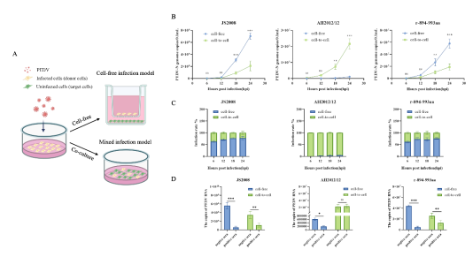 动物攻毒试验与免疫保护试验表明,将变异株的894–993 aa区域替换为经典株序列后,病毒毒力显著降低,且中和抗体逃逸能力受损。机制研究进一步揭示,变异株S2亚基894–993 aa区域通过增强病毒膜融合能力,促进病毒细胞间传播,进而实现中和抗体的逃逸。此外,蛋白结构建模显示,该区域可改变S蛋白的表面理化性质,进而可能干扰抗体对抗原表位的识别与结合。