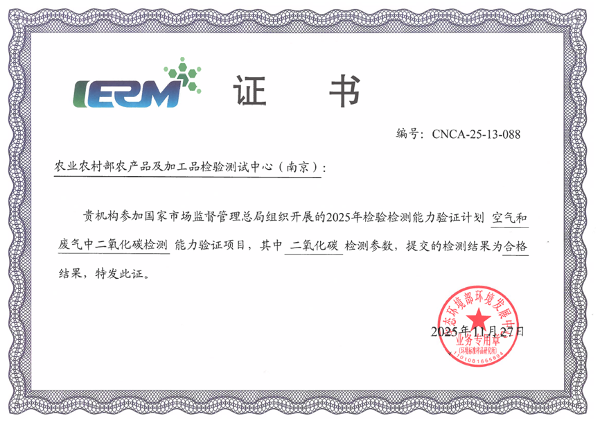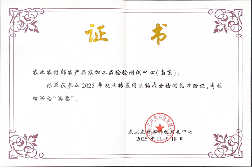 近日,农业农村部农产品及加工品检验测试中心(南京)(简称“部级中心”)收到《关于公布2025年全国农产品质量安全检验检测技术能力验证结果的函》,确认部级中心参加农业农村部农产品质量安全监管司组织的“农产品中农药残留检验检测”、“畜禽产品中兽药和违禁添加物残留检验检测”、“土壤中金属元素检验检测”等6项能力验证均取得了“合格”结果;另外,部级中心还积极参加国家市场监督管理总局组织的“空气和废气中二氧化碳检测”和农业农村部科技发展中心组织的“农业转基因生物成分检测”能力验证,考核结果为“合格”或“满意”。