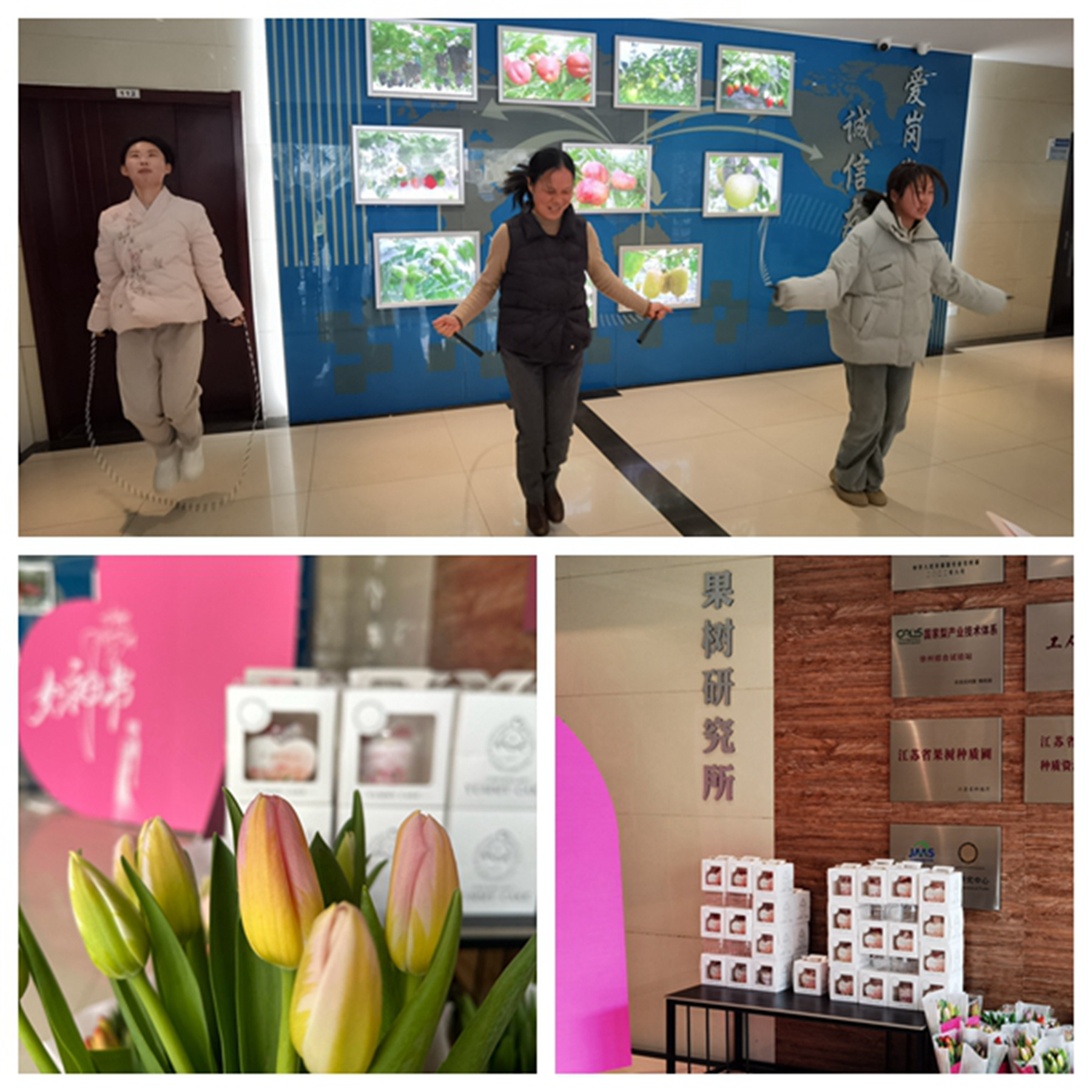 当天中午,所分工会委员和所办人员合力在一楼大厅搭建了一个温馨的“女神拍照区”,把鲜花和小礼品摆放好,把游戏区布置好,静候“女神”们的到来。在“哇,好漂亮”的赞叹声中,活动开始,所长沈志军为女同胞送上精美花束和节日祝福,副所长、所分工会主席曹娟组织大家开展“夹豆子、喝什么、跳绳”等小游戏,大家在欢声笑语中放松身心,在趣味游戏中尽享节日欢乐,忘却工作的疲倦,感受果树大家庭的温暖。