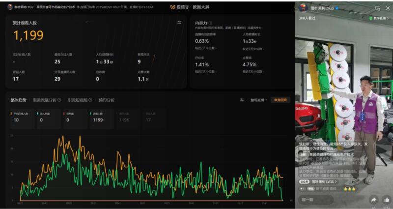 在线上直播环节,项目负责人曾锦详细介绍了南方果园(桃、梨)全程机械化科研基地概况以及果园智能农机装备,并在现场演示了除草机器人、采摘机器人、风送喷雾机等多种果园机具,吸引了超1000人在线观看,观众踊跃互动,气氛热烈。