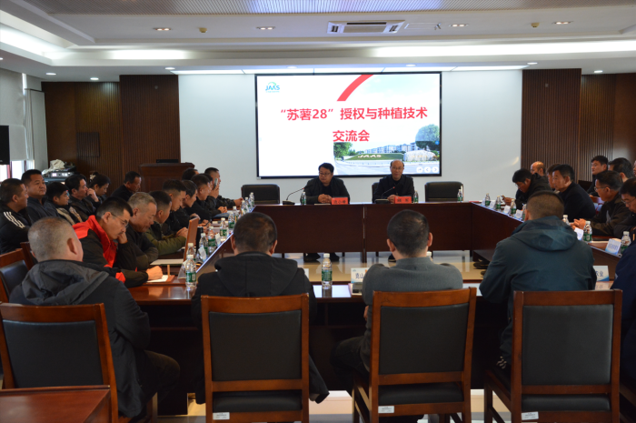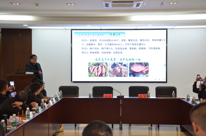为更好的推进我院甘薯新品种及新技术等科技成果转化,助力甘薯产业高质量发展,12月10日,粮作所举办“苏薯28”授权与种植技术交流会。院成果转化处处长顾军出席活动,粮作所副所长边小峰主持会议。来自江苏、安徽、山东等主要产区的甘薯种苗、种植企业50多名代表参加了此次交流会。