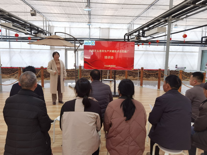为确保靖江香沙芋春耕备播工作有序开展,2026年1月15日,亚夫科技服务靖江生祠工作站联合靖江市农业科学技术推广中心,在靖江市生祠镇举办“优质芋头高效生产关键技术示范推广培训会”。经作所药食同源作物团队专家,靖江现代农业产业园区、生祠镇、马桥镇、斜桥镇、靖城街道等示范基地负责人、科技示范户和技术骨干近30人参加。