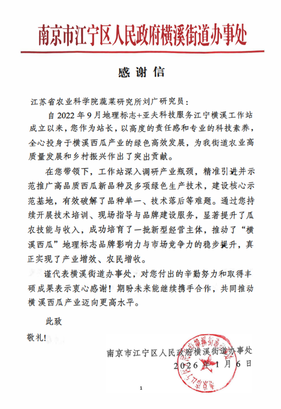 近日,南京市江宁区人民政府横溪街道办事处向我院蔬菜所刘广研究员发来感谢信,对其自2022年9月担任“地理标志+亚夫科技服务江宁横溪工作站”站长以来,为横溪西瓜产业绿色高效发展所作出的突出贡献表示诚挚感谢。