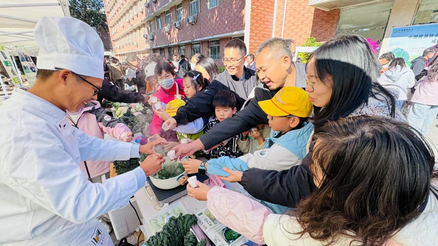 大会还举办了“美食嗨翻天”主题活动,以“科普+体验+品鉴”为核心模式,邀请广大市民与青少年参与科普讲堂、美食品鉴、新品种展示等互动活动。 “当花菜遇上科技,直接从‘食材’变为‘健康帮手’!”这一创新理念成为活动现场的焦点。甘蓝种质创新团队与响水县副县长、盐城市乡村振兴科技镇长团团长徐国彬共同展示推介了我院西兰花萝卜硫苷产业研究院研发的西兰花籽小分子活性肽产品。