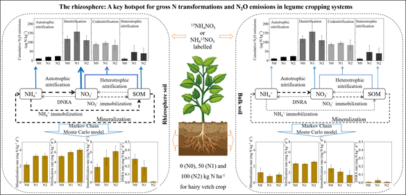近日,淮阴所土肥中心研究团队在豆科作物根际氮转化和氧化亚氮(N2O)排放研究方面取得重要进展。该成果以“The rhizosphere: a key hotspot for gross nitrogen transformations and nitrous oxide emissions in legume cropping systems”为题,发表于国际土壤科学顶级期刊《Geoderma》(JCR一区Top,IF=6.6)上,为豆科作物系统的温室气体减排提供理论依据。该项成果为我院与南京农业大学、海南大学、德国吉森大学等多家中外机构合作完成,淮阴所董玉兵博士为第一作者。研究首次通过15N同位素标记技术精准量化了根际与根区土壤在氮循环关键过程及N2O排放路径上的显著差异。结果表明,根际是氮循环和温室气体排放的“热点区域”,其过程对氮肥施用的响应远比根区土壤敏感。