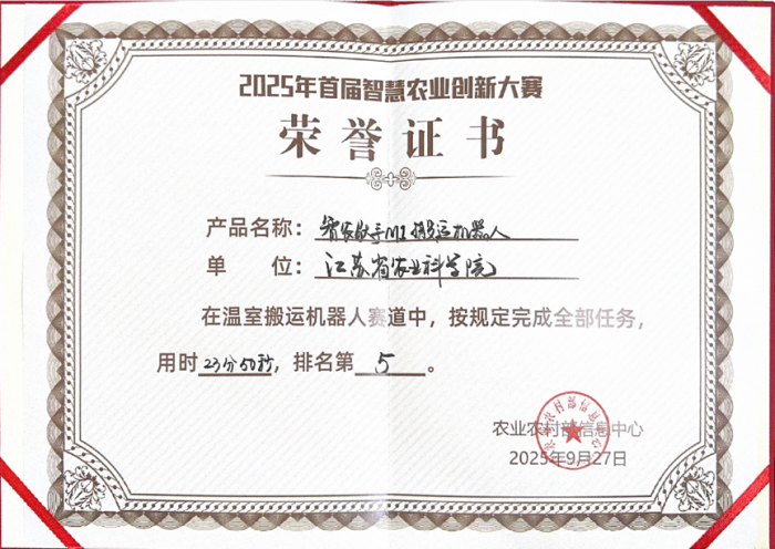 经过现场实操比拼和专家评审等激烈角逐,我院信息所智慧农业创新团队的参赛项目《温室搬运机器人-智农驮手M1》,在温室搬运机器人赛道与17家知名高校、科研院所及企业的强队同台竞技、脱颖而出,最终斩获全国第五名的优异成绩。