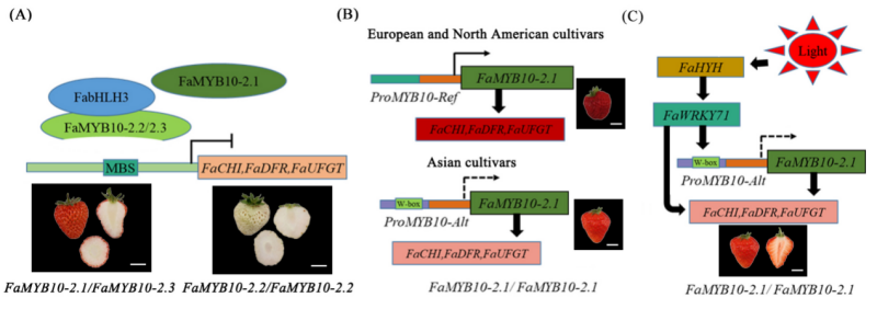 在光照条件下,FaHYH激活FaWRKY71表达,FaWRKY71不仅能直接调控花色苷合成相关基因,还可特异性结合Alt型启动子,从而增强FaMYB10-2表达,进而增加花色苷的积累,构建了一条独立于MBW复合体之外的光依赖的FaHYH-FaWRKY71-FaMYB10-2级联通路,解释了FaMYB10-2功能减弱后果皮仍能积累花色苷的补偿机制。