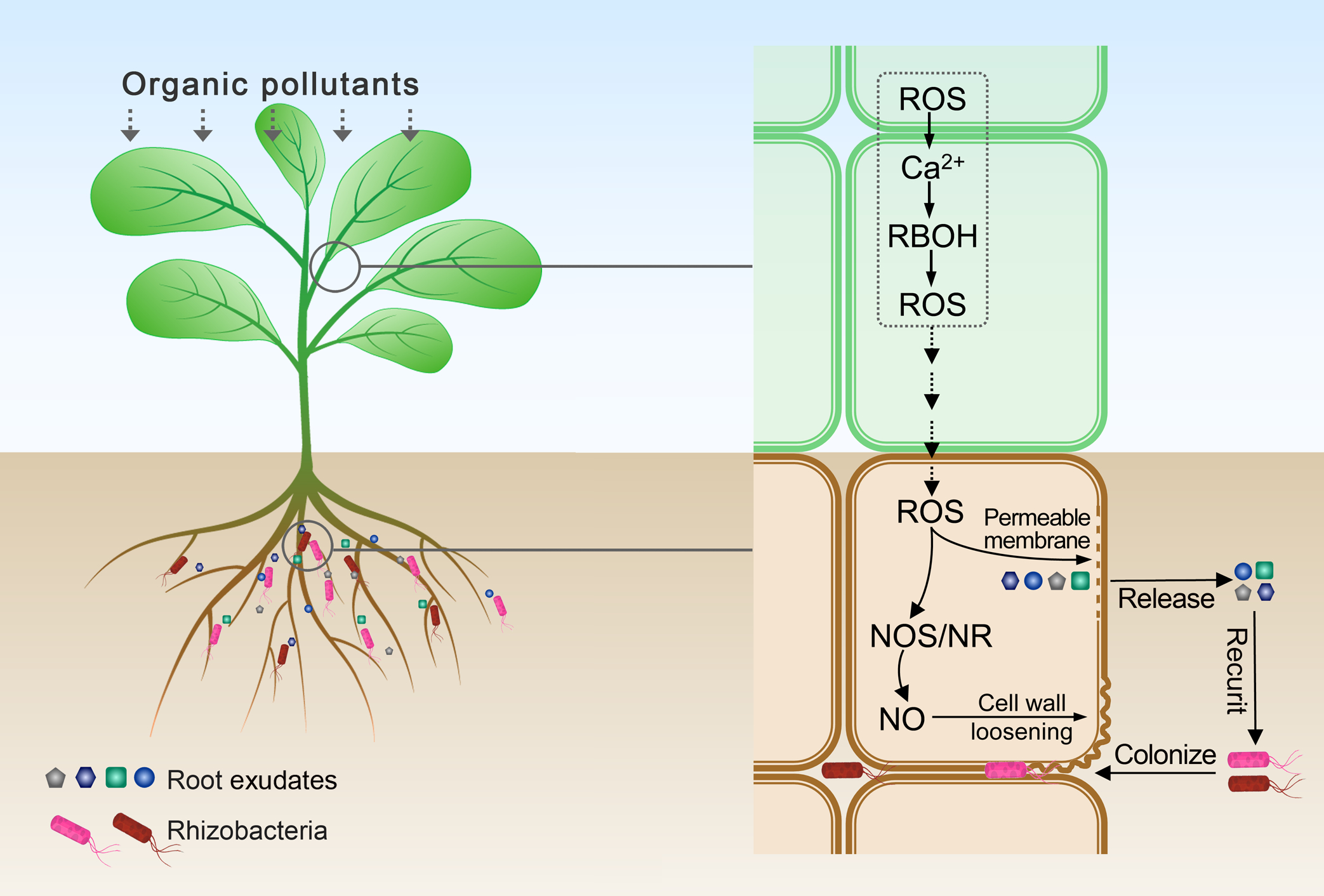 本研究以不结球白菜为材料,使其叶片分别暴露于五种有机污染物(包括三种常用农药:噻虫嗪、戊唑醇、乙草胺,以及两种持久性有机污染物:多氯联苯和多环芳烃),构建了植物长距离招募根际微生物的实验体系。结果发现,不同污染物均能引起根系“碳流出”,招募根际有益菌群(如Sphingomonas sp. LSS1 和Lysobacter sp. LSS2),促进有机污染物降解与植物生长。该体系证实,植物叶片在响应不同有机污染物暴露时,对根际微生物具有通用的招募模式,提示植物体内可能存在普适性的响应调控信号。进一步研究发现,叶片感知有机污染物暴露后产生活性氧(ROS)信号。结合ROS和Ca2+的时空响应模式分析、ROS清除剂和Ca2+通道抑制剂实验、以及基因表达分析,发现叶片ROS波动通过相邻细胞间的Ca2+-RBOH-ROS级联信号模块长距离传递至根部。到达根部的ROS信号通过双重机制调控根际微生物:一方面,ROS氧化细胞膜脂质,增加膜透性,促进根系分泌物释放,招募根际有益细菌LSS1和LSS2富集;另一方面,ROS激活下游一氧化氮(NO)信号,NO通过增强纤维素酶活性,降解细胞壁中的纤维素,使细胞壁松弛,有利于被招募的有益菌LSS1和LSS2在根部定殖。定殖的有益菌进一步反馈促进植物生长并加速有机污染物降解,由此形成植物“呼救”根际微生物、建立系统环境适应的闭环过程。
